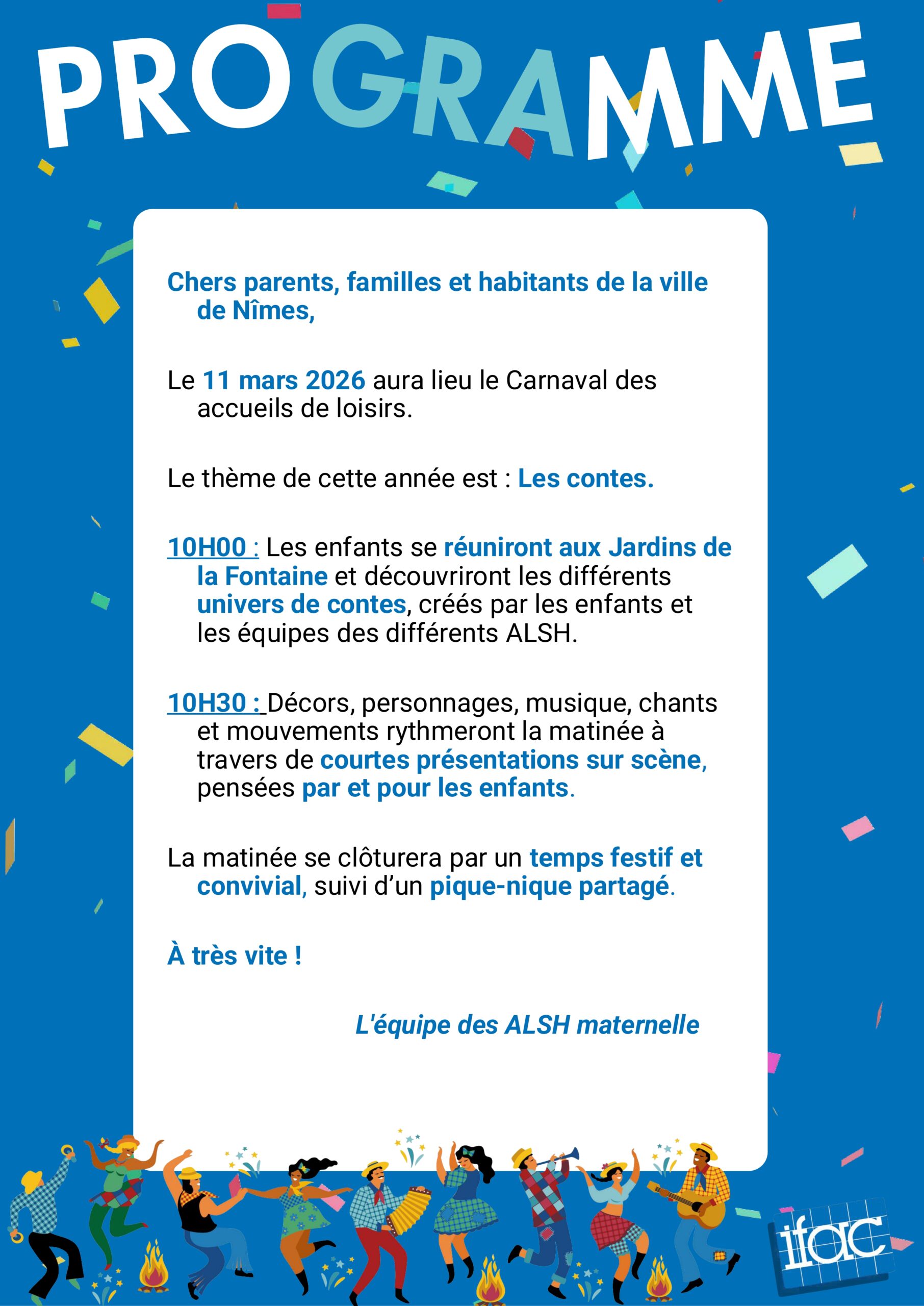 Le 11 mars, laissez-vous emporter par un tourbillon de couleurs et d’imaginaire avec le carnaval des ALSH maternelles !